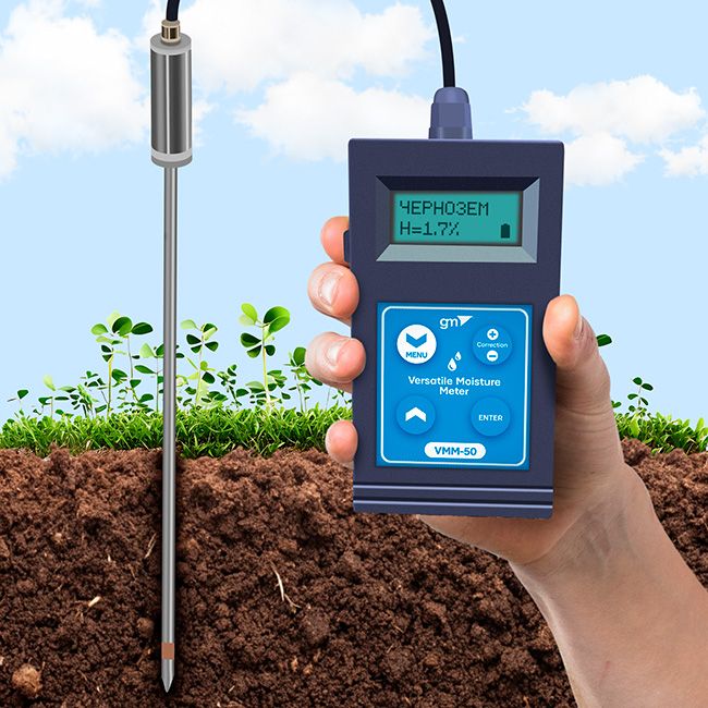 Miernik wilgotności gleby VMM-50 jest przeznaczony do diagnozowania wilgotności względnej różnych materiałów, takich jak gleba, glina, gliniasta gleba, piasek, a także torf, kompost, słoma, zboża, cement, beton i inne. Jest skutecznie stosowany w systemach irygacyjnych, hydrologii, budownictwie (do określania wilgotności betonu, piasku, żwiru oraz w betoniarkach), przy pomiarze poziomu wód gruntowych, a także do sprawdzania wilgotności substancji granulowanych, proszkowych lub pastowatych.